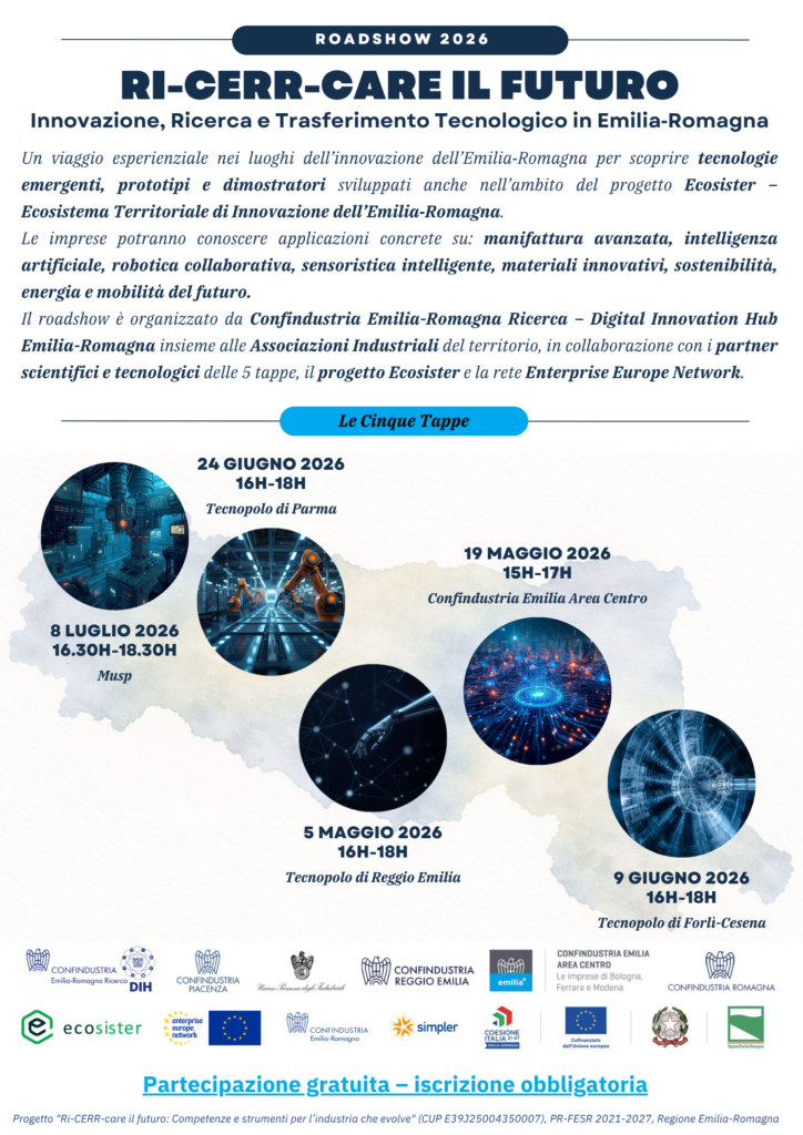 Il roadshow, articolato in 5 appuntamenti territoriali, valorizza anche i risultati del progetto Ecosister – Ecosistema Territoriale di Innovazione dell’Emilia‑Romagna, presentando prototipi, dimostratori e soluzioni pronte per il trasferimento tecnologico: